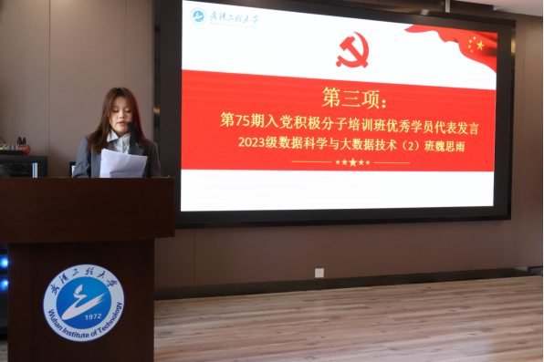 随后,第75期入党积极分子培训班优秀学员代表魏思雨同学分享到个人的党校学习经历让她收获颇丰,不仅淬炼了思想,更坚定了理想信念。她表示会将个人理想融入党和国家的事业中去,为实现中华民族伟大复兴贡献自己的青春力量。