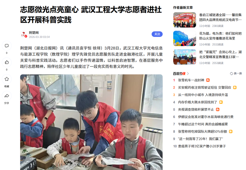 荆楚网(湖北日报网)讯(通讯员袁宇恒 徐琲)3月28日,武汉工程大学光电信息与能源工程学院(数理学院)理学先锋党员志愿服务队走进金融港社区,开展儿童关爱与科普实践活动。志愿者们以手作传递温情,以科普启迪智慧,在基层服务中践行志愿精神,陪伴社区少年儿童度过了一段充实而有意义的时光。