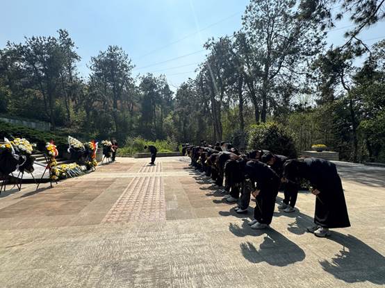 石门峰纪念公园庄严肃穆,苍松翠柏矗立。全体人员怀着崇敬之心,首先来到武汉抗战纪念园,在武汉保卫战纪念碑前整齐列队、神情凝重,向革命先烈敬献鲜花,随后集体默哀三分钟,寄托对先烈的深切缅怀与崇高敬意,追忆他们为民族独立、人民解放奋斗的峥嵘岁月。