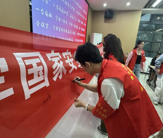 专题宣讲第二个环节是开展 “国家安全我承诺” 主题签名活动 。全体参与人员依次在主题横幅上郑重签名,以庄严仪式表达维护国家安全、守护社区平安、履行岗位责任的坚定决心。签名活动进一步凝聚安全共识,强化使命担当,推动国家安全理念从 “入耳入眼” 到 “入脑入心”,引导社区、物业工作人员以实际行动当好社区安全 “守护者”、居民财产 “守护人”。
