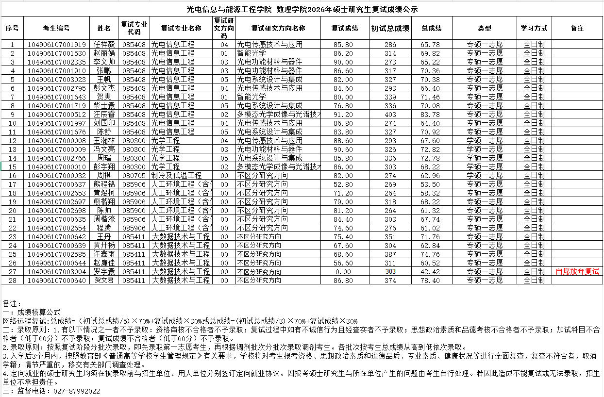 光电信息与能源工程学院 数理学院2026年硕士研究生一志愿复试成绩公示