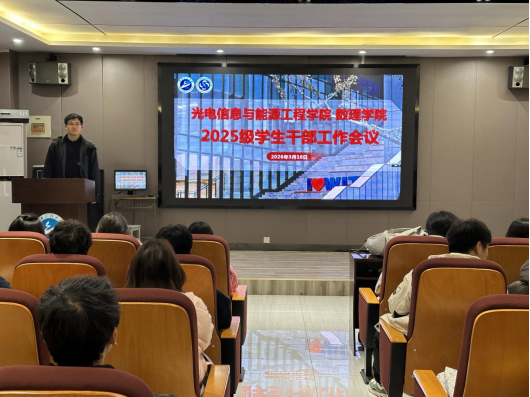 本网讯(通讯员 胡文虎)新学期,新气象,新要求。3月16日,光电信息与能源工程学院(数理学院)在二实验楼401会议室召开25级学生干部工作会议,全体班长、团支书、学习委员参加会议,2025级辅导员胡文虎主持。