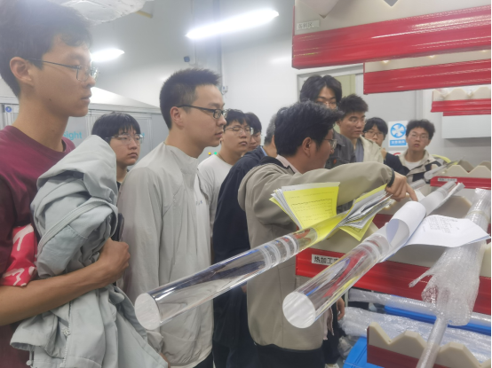 最后,讲解员特意展示了不同加工阶段、粗细各异的光纤预制棒实物,供同学们直观观察对比。现场互动氛围热烈,同学们认真倾听、积极提问,在沉浸式体验中加深了对光纤制造工艺与光电技术发展现状的理解。